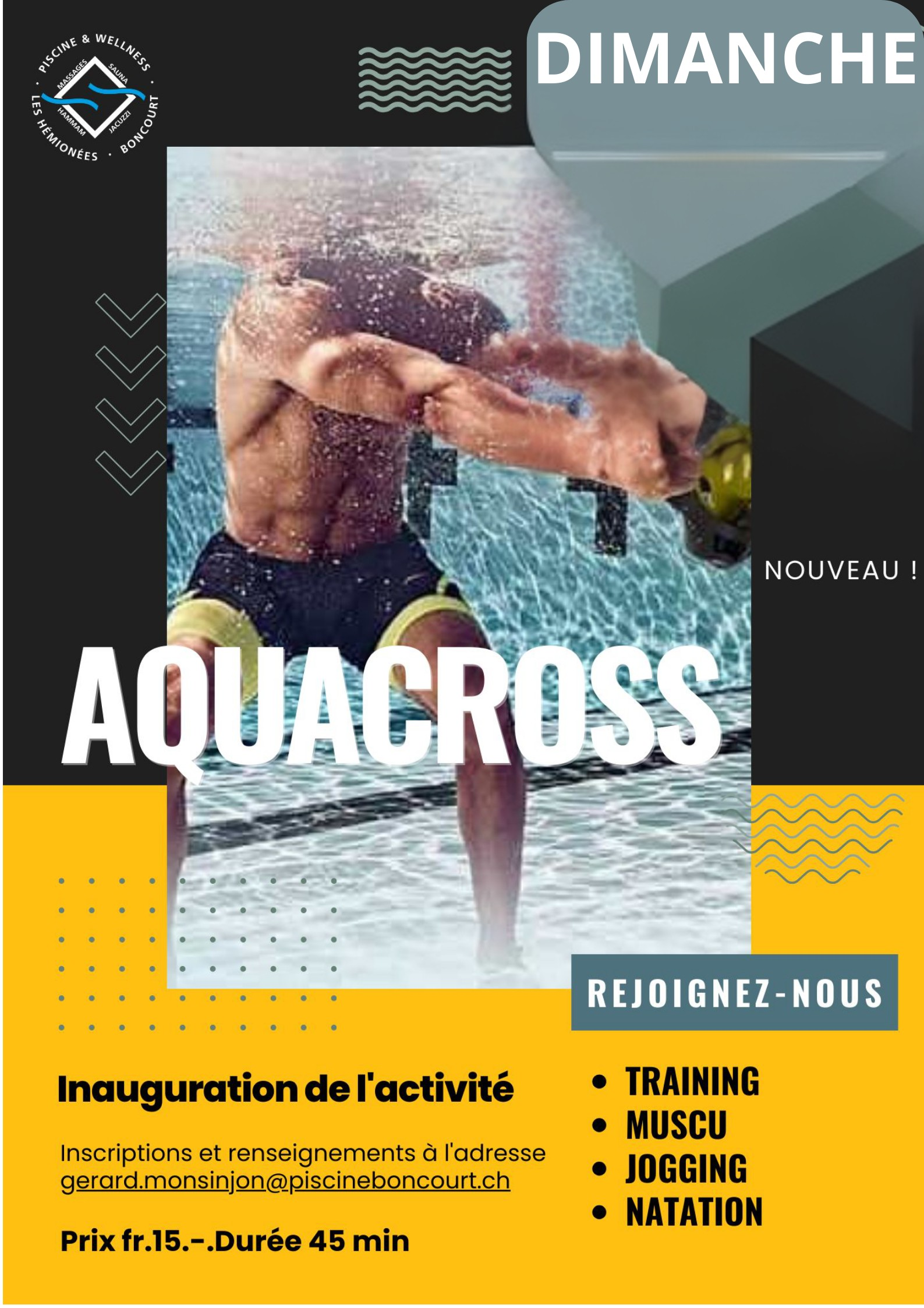 Les séances 45 minutes, pour un prix de CHF 15.-. Profitez d’ateliers variés dans et hors de l’eau, incluant training, musculation, jogging et natation.